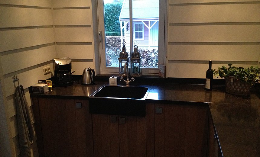 Onder een overkapte veranda staat een mooie landelijke buiten keuken die je heerlijk in de zomer en winter dagen kan gebruiken